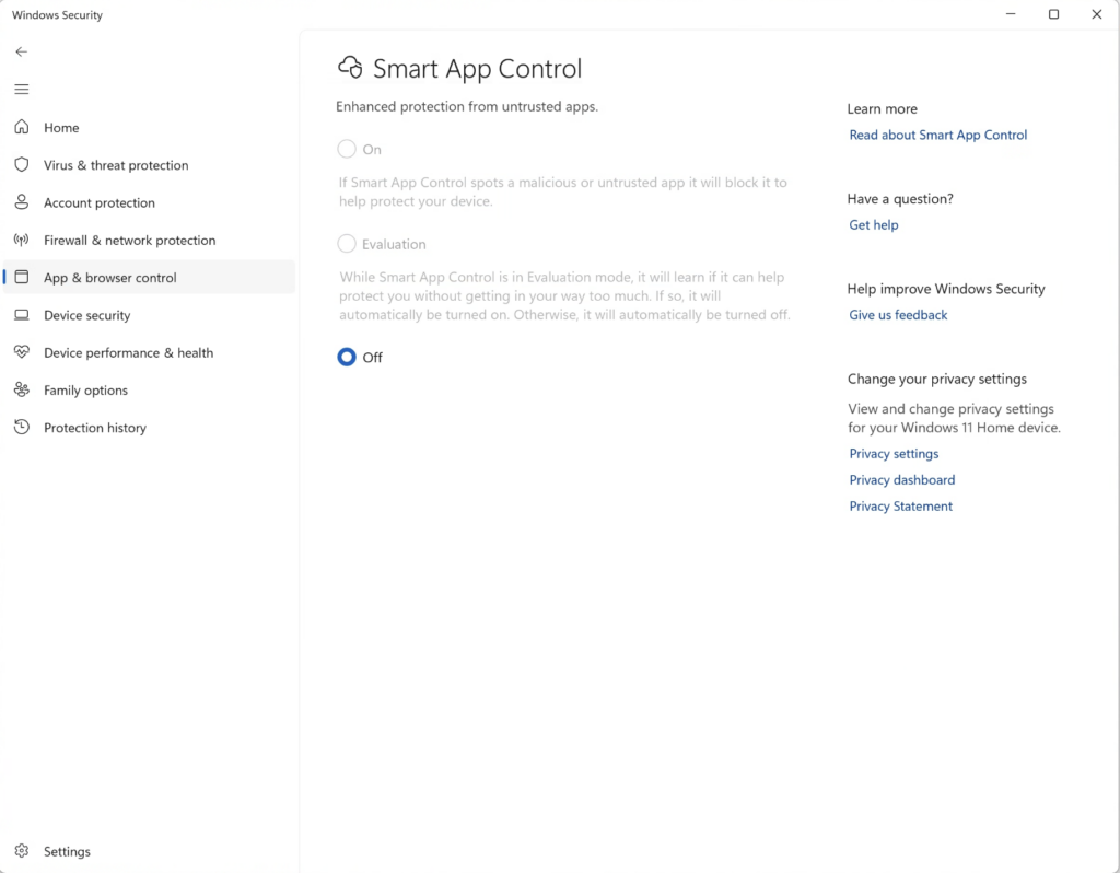 WindowsOS จะต้องปิดการทำงานของ Smart App Control ใน Windows Security
